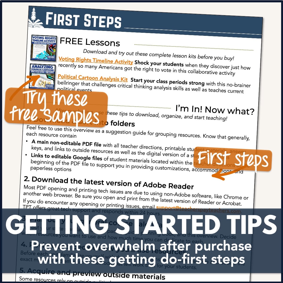 - 1-Page First Steps: Links to freebies to try before you buy, How-to Guide for getting started after purchasing and