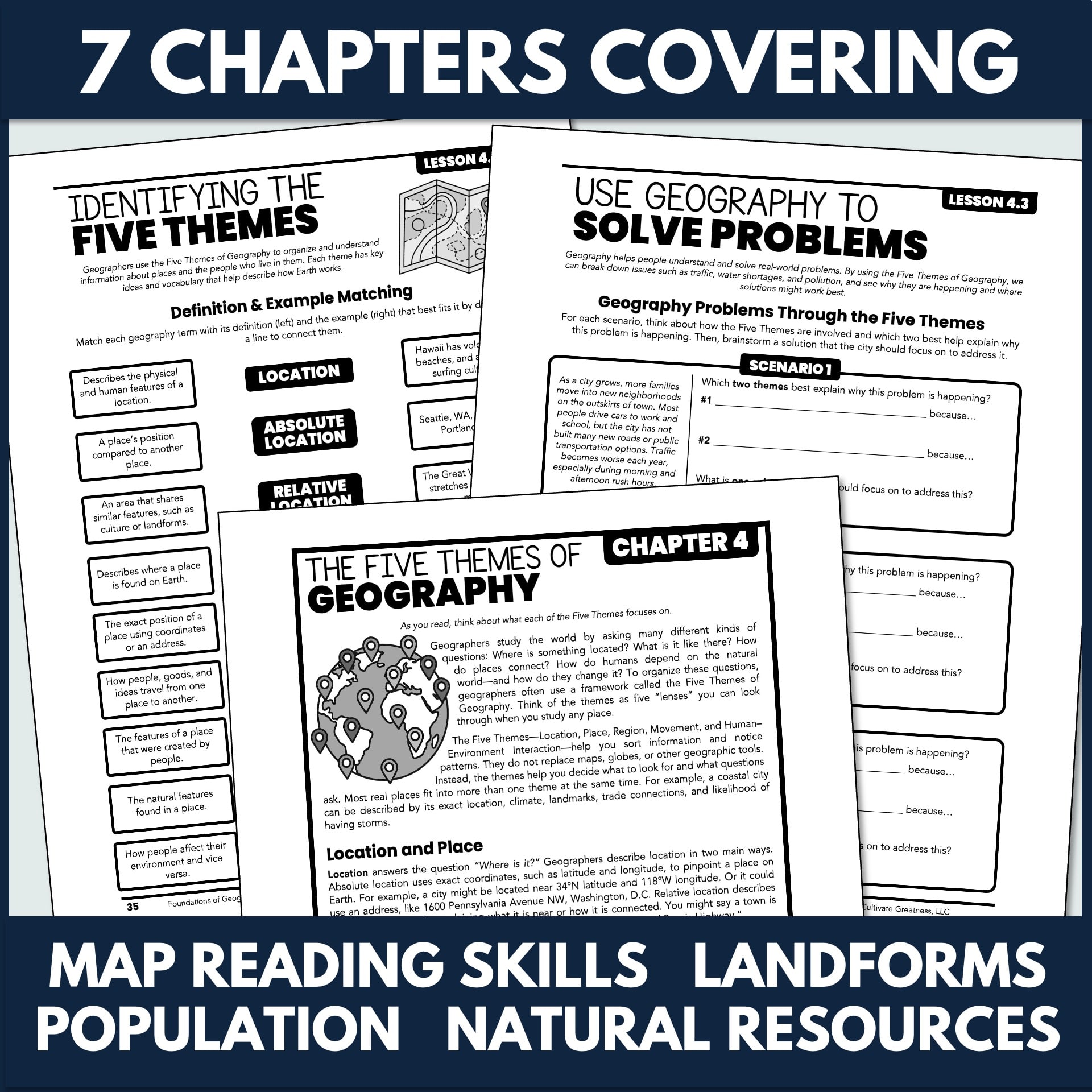 - Clear explanations of core geography concepts written at an accessible reading level