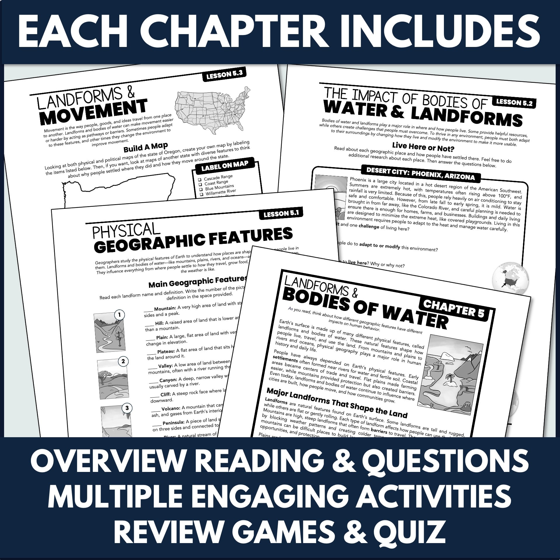 Through short, student-friendly readings, hands-on activities, map practice, and interactive review games, students explore landforms and bodies of water, population patterns, natural resources, environmental challenges, and geographic decision-making. Concepts are explained clearly, practiced meaningfully, and connected to real-world examples.