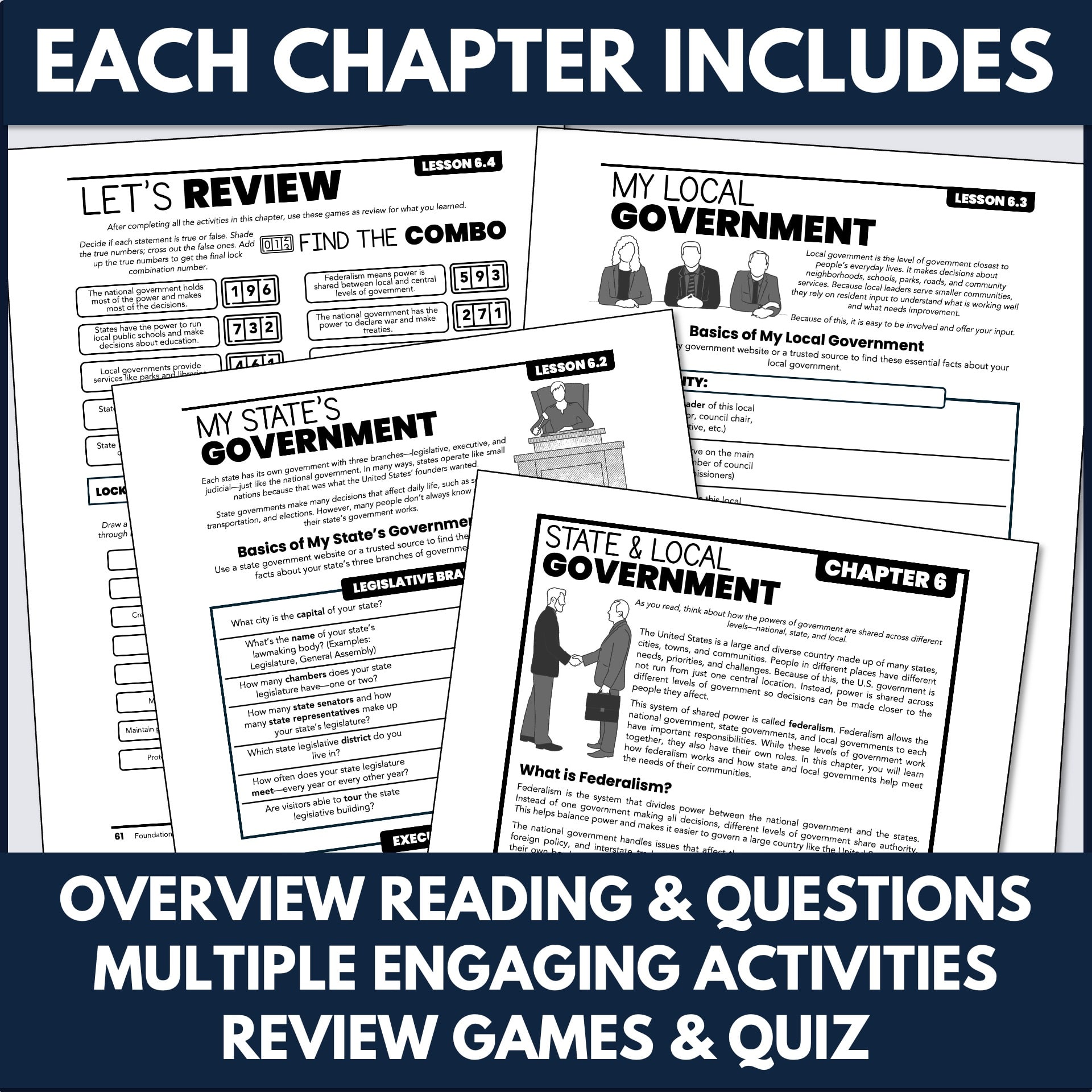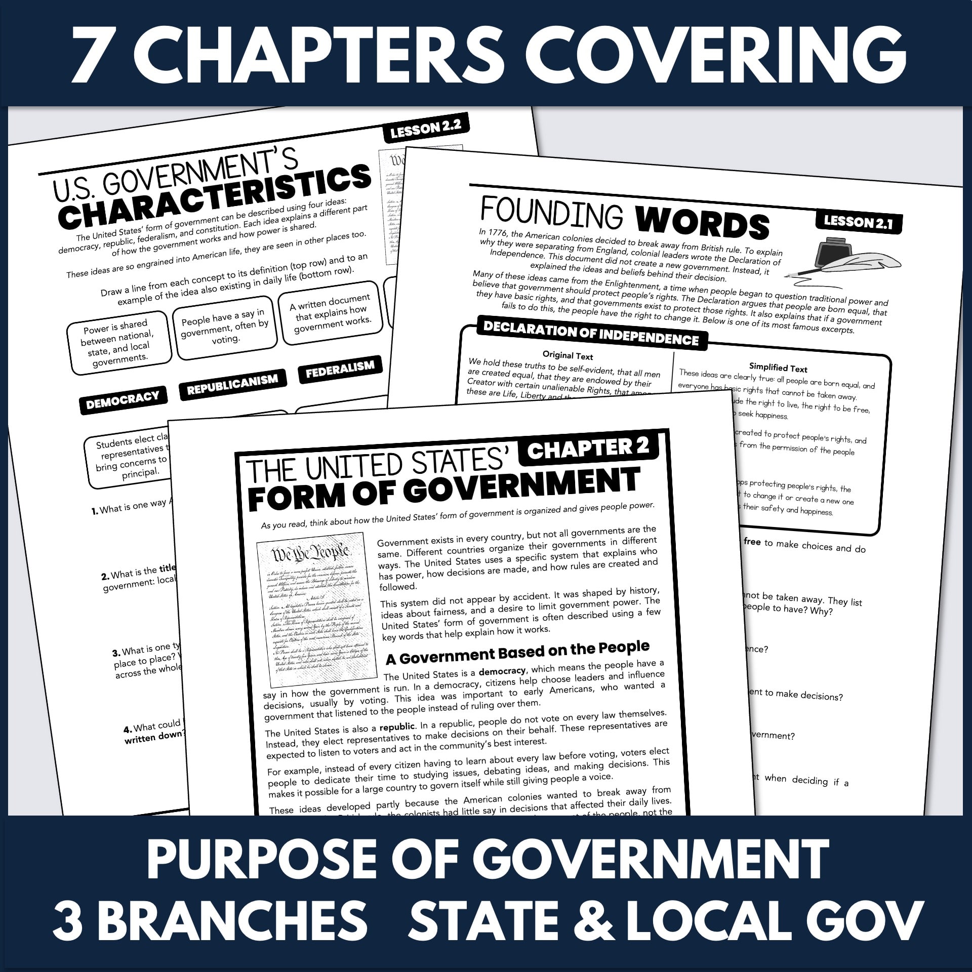 - 7 focused chapters covering the purpose of government, American values, all three branches, federalism, and state and local government