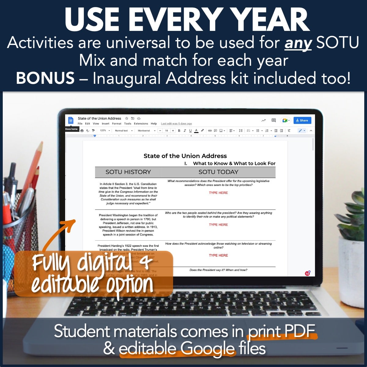 This kit works for any year’s speech. Just pick your activities, grab the transcript, stream the speech, and go!