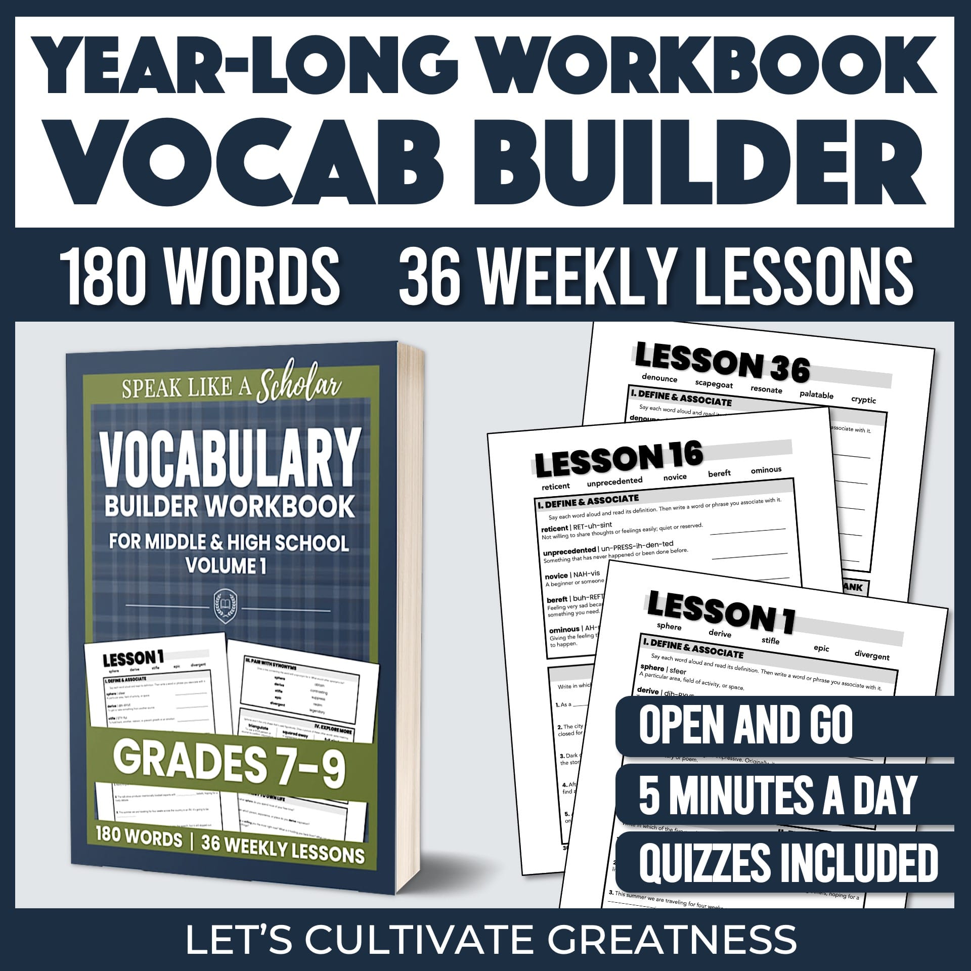 This workbook teaches 180 essential academic and everyday words that appear frequently in literature, nonfiction, college entrance exams, and the real world. Designed around a typical 36-week school year, it’s perfect for middle and high school students—or anyone ready to start their vocabulary journey.
