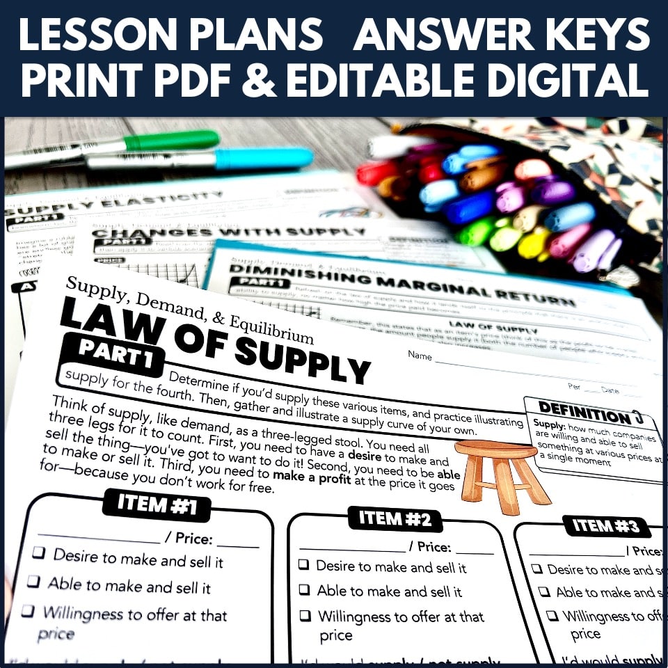 - Law of Supply: Graph supply data examples, simulate the law of supply with origami, experience diminishing marginal return by making a paper chain, analyze factors that change supply and impact supply elasticity, research ways mega-corporations secure their supply chain with vertical integration